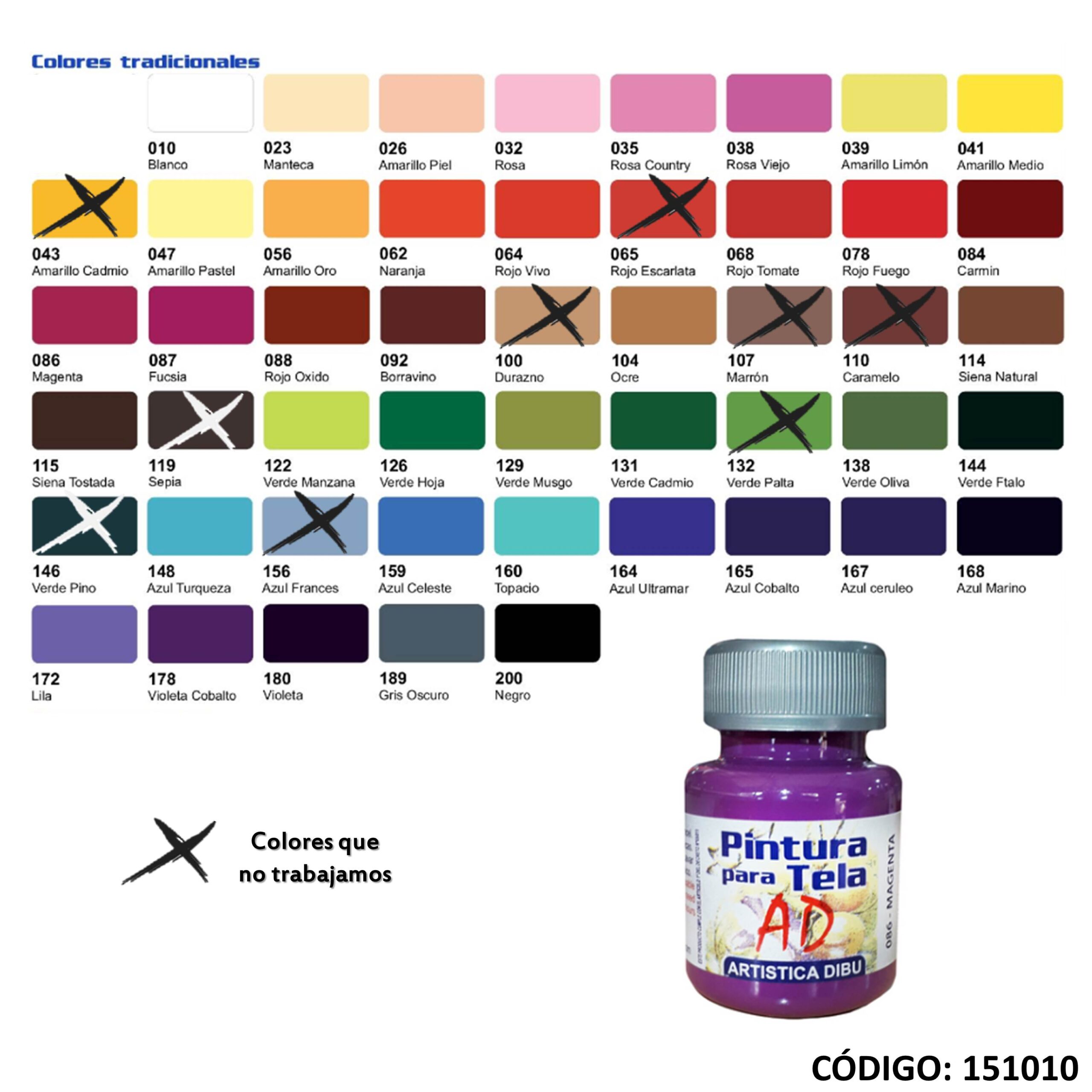 Amarillo, Azul, Blanco, Marron, Marron Claro, Negro, Rojo, Rojo Cadmio, Rosado, Verde